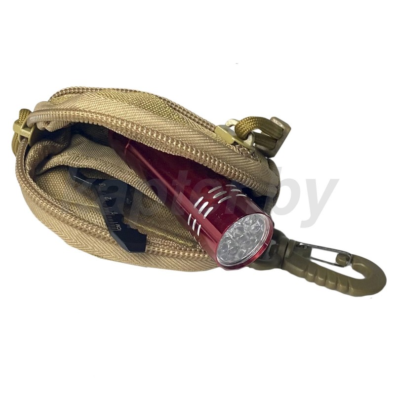 Подсумок состоит из двух вместительных отделений на молнии. Оснащен стропами MOLLE, прочным карабином, застежкой. Легко крепится к тактическому рюкзаку, разгрузочному ремню, жилету и другому снаряжению.