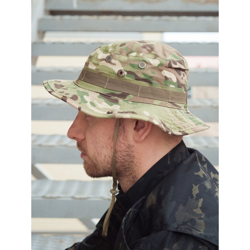 Реплика. Панама US GI - идеальная защита головы в жаркие солнечные дни. У него широкие волнистые поля шириной около 8 см. их можно поднять с помощью ремня для подбородка или кнопок на полях. Петли по периметру служат в качестве удерживающего устройства и для крепления камуфляжа или мелких предметов. Boonie также имеет решетчатые вентиляционные отверстия.