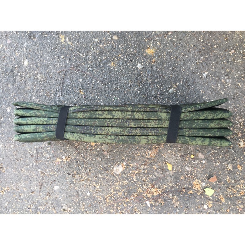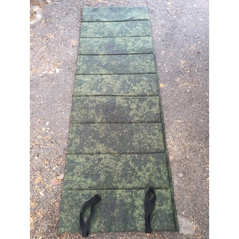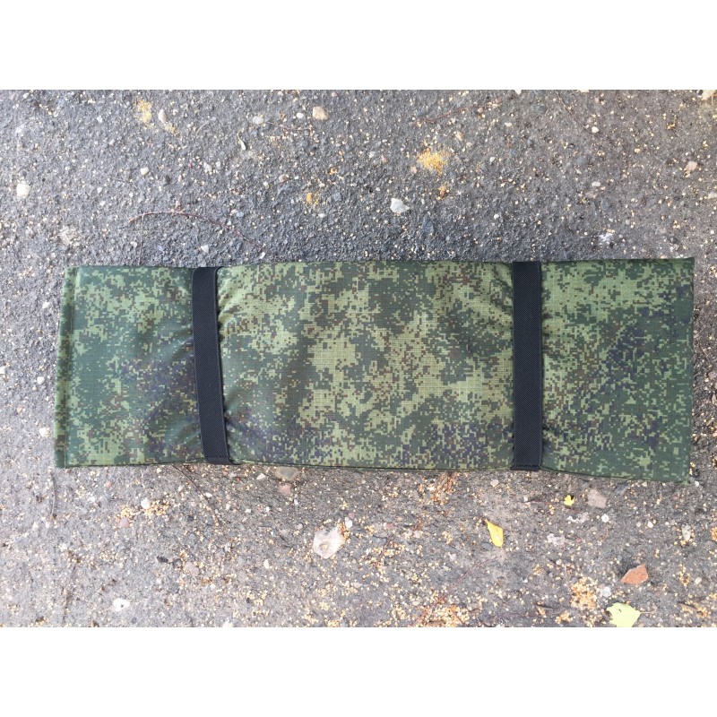 Коврик туристический полиуретановый теплоизоляционный складной обшитый камуфлированной тканью. Каремат используется для сохранения тепла и защиты прочего бивачного снаряжения от проколов на неровном рельефе. В сложенном состоянии коврик фиксируется торцевыми хлястиками. Такой вид туристического коврика удобен для складывания, транспортировки в машине или поверх рюкзака. Камуфлированная ткань защищает коврик от грязи и повреждений.