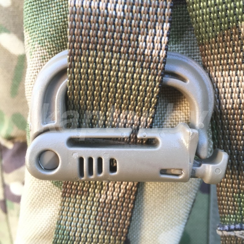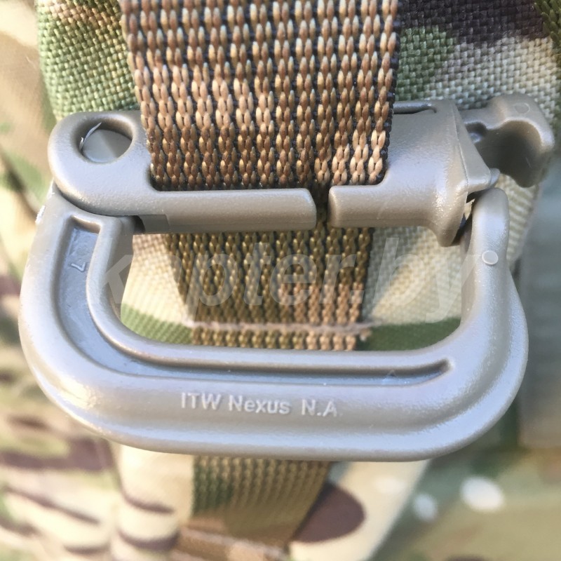 Как видно на фото выше, дюймовая стропа пропускается внутри специального слота на основании GrimLoc, соответственно слететь с неё он, в отличие от обычного карабина, не может ни в открытом, ни в закрытом состоянии. Стоит также отметить, что данный аксессуар пригоден только для хозяйственного использования, т.к. разорвать его можно даже сильным рывком руки. Сделано это намеренно для того, чтобы в случае цепляния, создающего угрозу жизни, можно было сорвать или сбросить зацепившийся подсумок или элемент снаряжения. Ни в коем случае не используйте ITW Nexus GrimLoc для альпинизма, т.к. для подвешивания чего-то большего нежели перчатки, очки, баллистические маски, коммутации шлангов питьевых систем, проводов коммуникационных устройств и оружейных ремней он не пригоден.