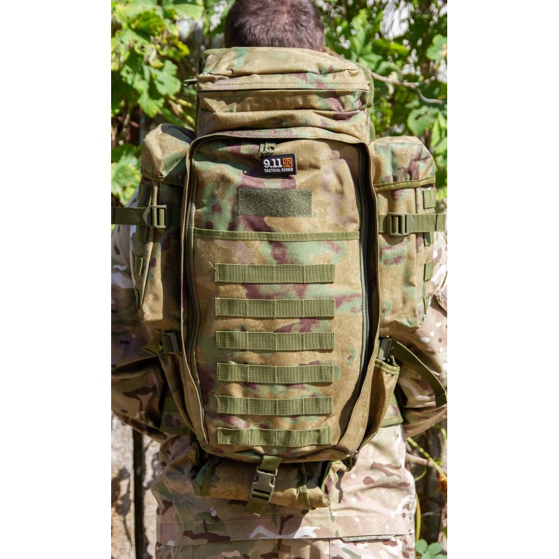 Фронтальная часть оснащена ячейками molle для крепления подсумок. Молния расположена по всему периметру спины рюкзака, что открывает свободный доступ ко всем его частям. Область спины, ремня и талии выполнена из дышащего хлопкового материала, что не мешает отходу влаги.