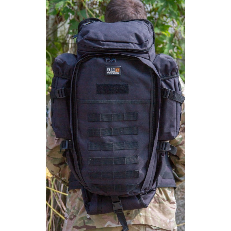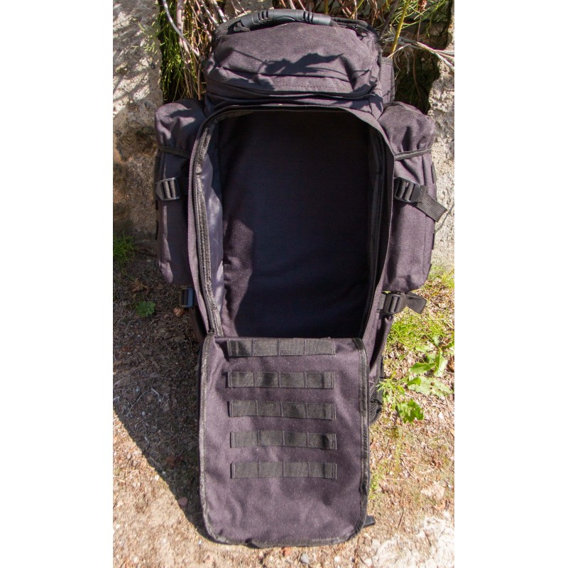 Фронтальная часть оснащена ячейками molle для крепления подсумок. Молния расположена по всему периметру спины рюкзака, что открывает свободный доступ ко всем его частям. Область спины, ремня и талии выполнена из дышащего хлопкового материала, что не мешает отходу влаги.