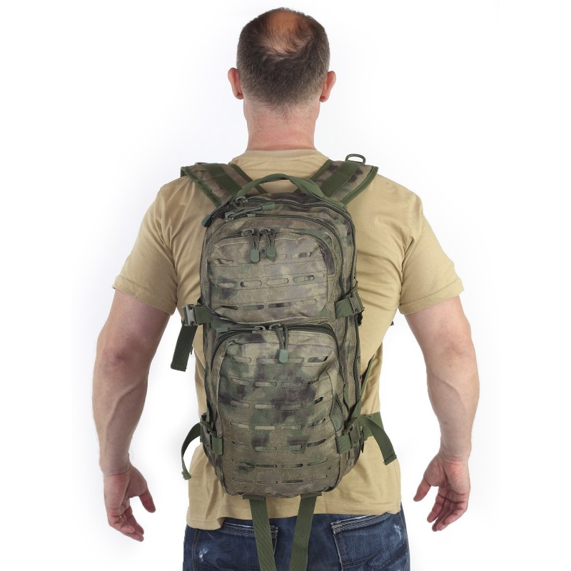 Данная модель тактического штурмового рюкзака состоит из двух больших отделений с застежкой-молнией с различными сетчатыми внутренними карманами, двух маленьких передних карманов, а также встроенного кармана на липучке для гидросистемы. Все отделения закрываются на крепкие двухсторонние молнии. Эргономичные плечевые лямки шириной около 5 см, регулируются по длине. Кроме того, рюкзак оснащен плотной демпферной спинкой с вентиляционной системой и регулируемым поясным ремнем на застежке Fastex.