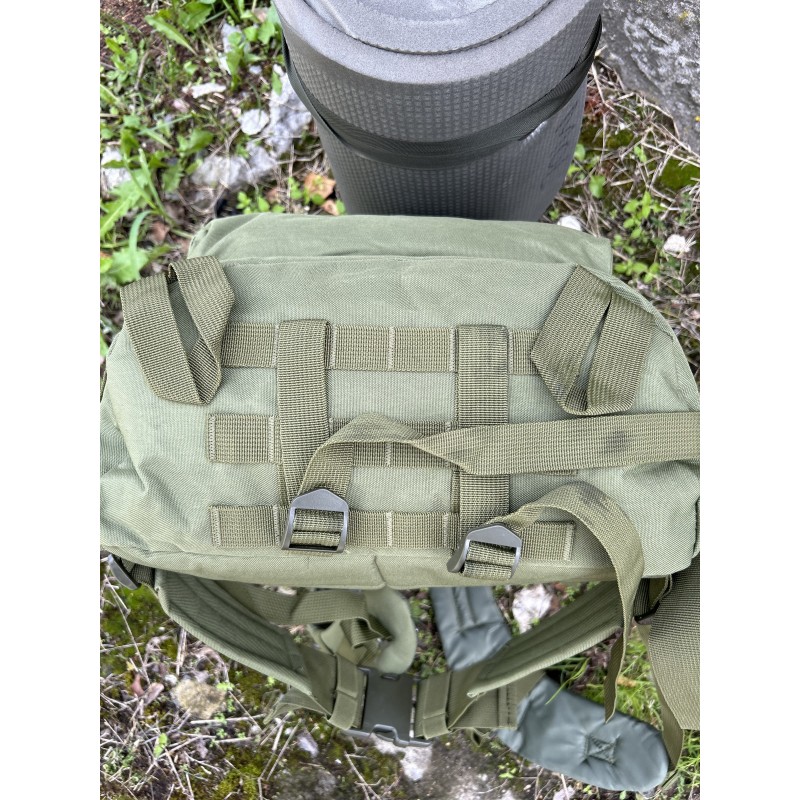 На лицевой, нижней и боковых сторонах корпуса рюкзака имеются нашитые MOLLE-стропы для крепления дополнительного снаряжения. Сверху и снизу также имеются петли для фиксации свернутого спального мешка.
